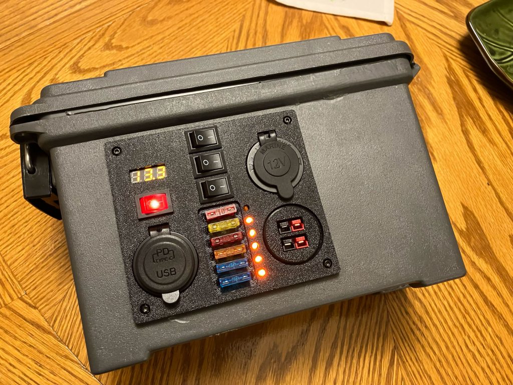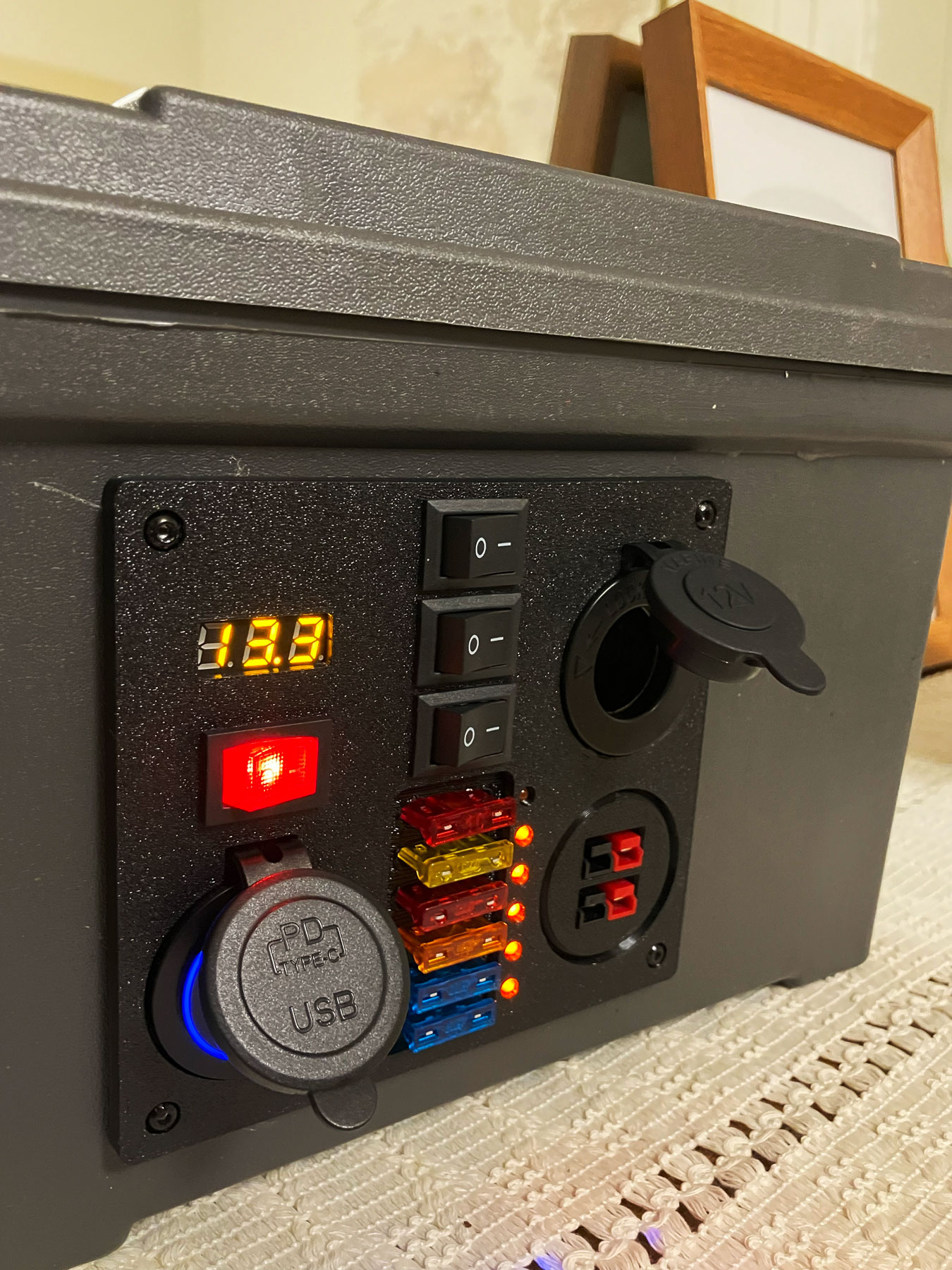- Two Anderson Powerpole ports mounted in a custom 3D-printed housing. Each one is separately fused so you can hook up different devices or loads without one issue taking everything else down.