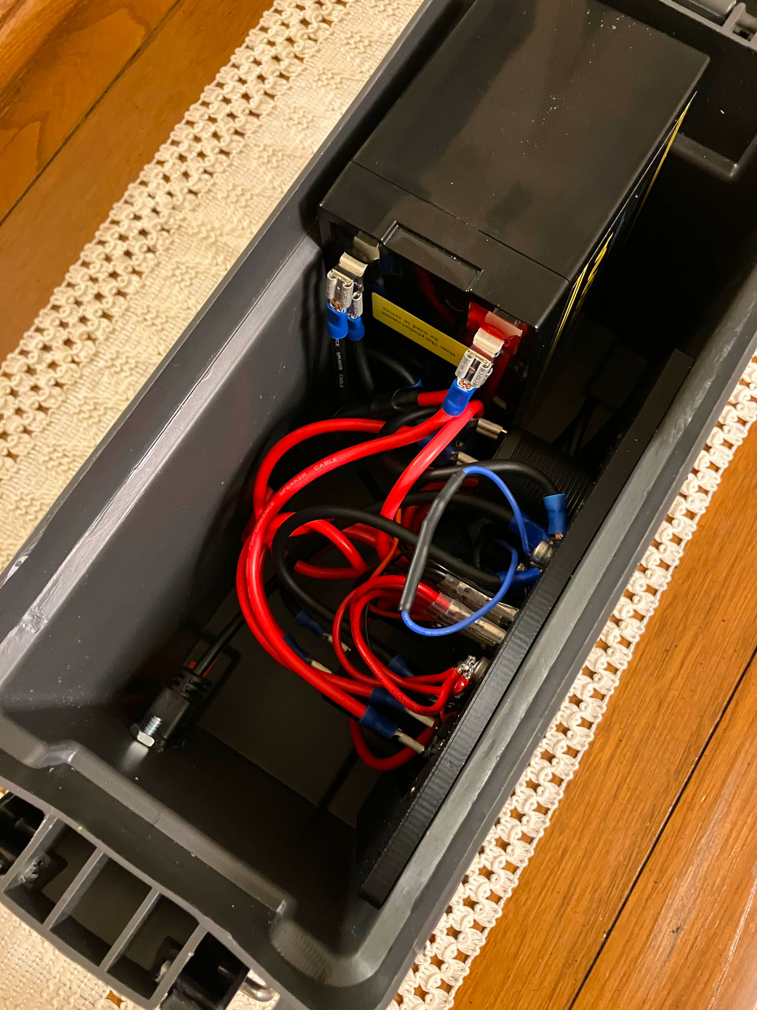 I also added a simple panel-mount SAE port (not visible in all the photos) for plugging in the LiFePO4 charger. It feeds straight through the first fuse and into the battery.